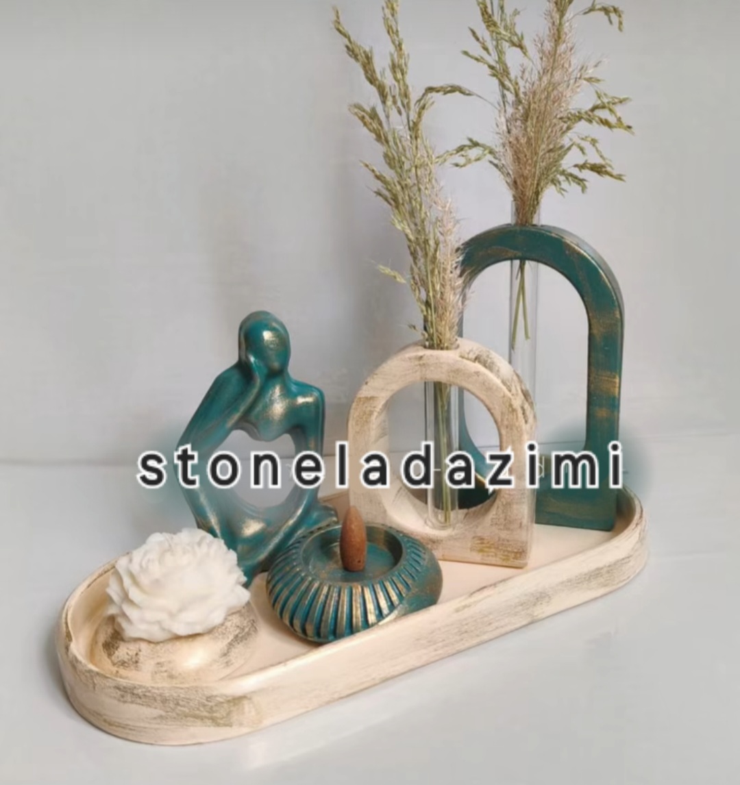 ست شامل:سینی بیضی،جاعودی،دوسایزگلجاهمراه شیشه، مجسمه متفکر، شات شمع)